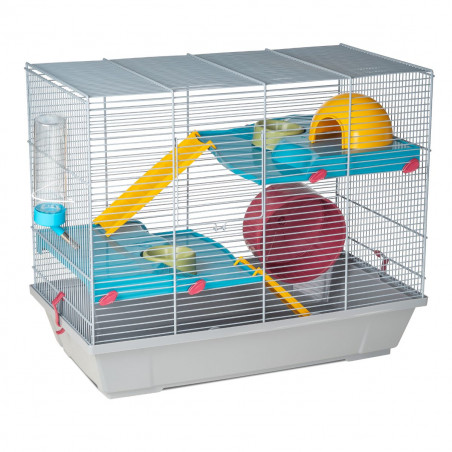 Cette grande cage, très complète, est idéale pour les hamsters russes et Roborosky, grâce à une maille avec une séparation entre les fils de 7mm. Fabriqué en Espagne Fabriqué en Europe (Espagne), avec de la peinture époxy sans plomb et du plastique polypropylène non toxique. Comprend un abreuvoir.