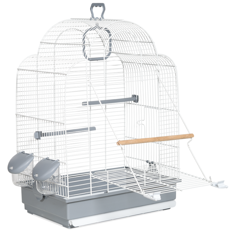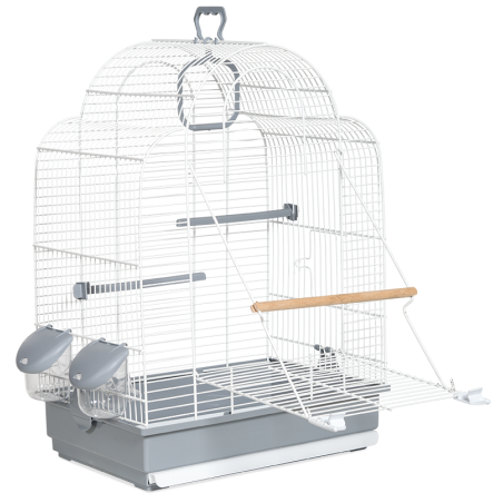 Cage avec une porte frontale pour permettre aux oiseaux de voler dans la pièce. Fabriqué en Espagne, avec de la peinture époxy sans plomb et du plastique polypropylène non toxique. Cage avec plateau amovible, facile à nettoyer.